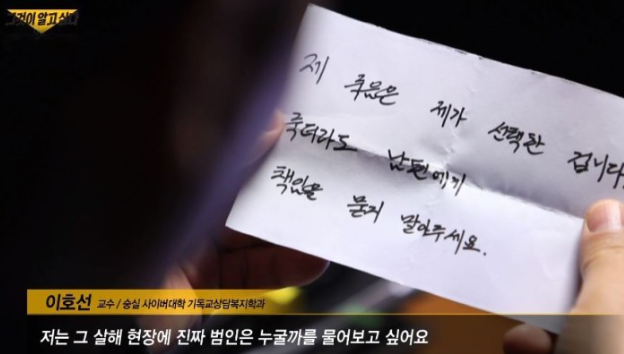 그것이 알고싶다 간병살인 제작진이 만난 그녀의 전남편은 부인의 자살을 도왔다 말을했습니다. 사망한 여자는 유방암 3기로 너무나 아픈 고통속에서 지내게됩니다. 그리고 12년전에 이혼한 전 남편에게 혼자 죽는것이 어려우니 자신의 자살할 수 있도록 도움을 청했다고합니다. 그리고 남편은 하루종일 죽고싶다고 도와달라고 요청했던 부인의 요구로 차에 번개탄을 피워 자살할수 있도록 해줬다고합니다. 재판당시 두 사람의 딸이 남편이 아내를 잘 챙겨왔고 돌본것을 이야기하며 선처를 호소한것과 그녀의 쪽지가 집행유예를 받을 수 있던 것입니다.