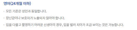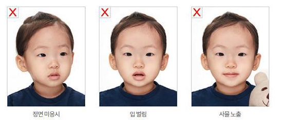 24개월 이하의 어린 영아 여권 사진의 기준도 성인과 비슷하나 신생아인경우 조금 입을 벌려 치아가 보이는건 괜찮다고합니다. 신생아를 제외하고는 입벌린 사진은 안됩니다.