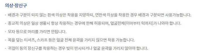 여권사진의 옷에는 특별히 정해둔 규정은 없습니다. 편한 옷차림으로하되 배경과 동일한 흰색은 피해주시는게 좋습니다. 그리고 모자를 쓴 사진은 사용이 불가능하며, 귀걸이를 착용했는데 반짝거려 얼굴 윤곽을 알아보는데 방해를 준다면 이사진도 사용불가능합니다.