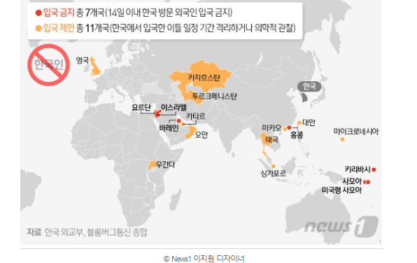 안녕하세요. 우리나라의 신종 코로나바이러스 감염증이 대구를 중심으로 전국에 빠르게 확산하면서, 세계 각국이 한국인 입국금지 또는 제한 조치들이 한국인 입국 제한 국가들이 나오고 있는데요. 워낙 확산세가 빠르다 보니 다른나라에서 봤을때 이런 조치를 내린거 같습아요.