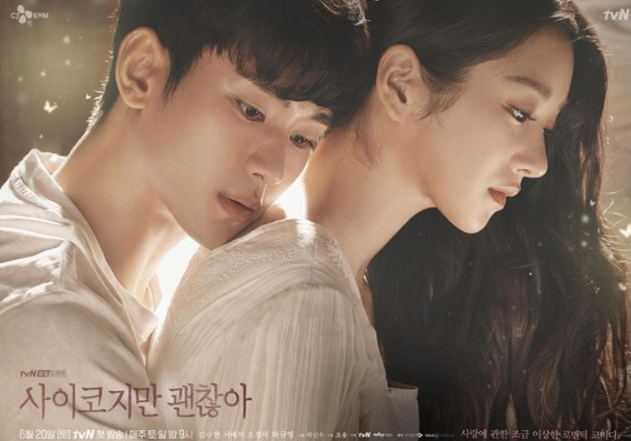 사이코지만 괜찮아 '는 힘든 삶의 무게 고생을 해서 사랑을 거부하는 정신 병동 간병인 김수현과 선천적으로 사랑이란 감정을 모르는 동화 작가인 서예지가 만나 함께하면서 서로의 상처를 안고 치유해가는 스토리를 담은 판타지 러브스토리로 좀 독특한 로맨틱 코미디입니다.