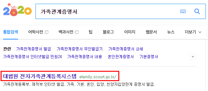 네이버나 다음 포탈사이트에서 [ 가족관계증명서 인터넷발급 ] 를 검색하시거나[ 가족관계증명서 발급 ] [대법원 가족] [ 가족대법원 가족관계증명서 ] 등 비슷한 키워드로 검색하시면 첫번째로 대법원 전자가족관리등록시스템이 보이실꺼에요. 첫번째 뜨는 사이트를 클릭해주시면 됩니다.