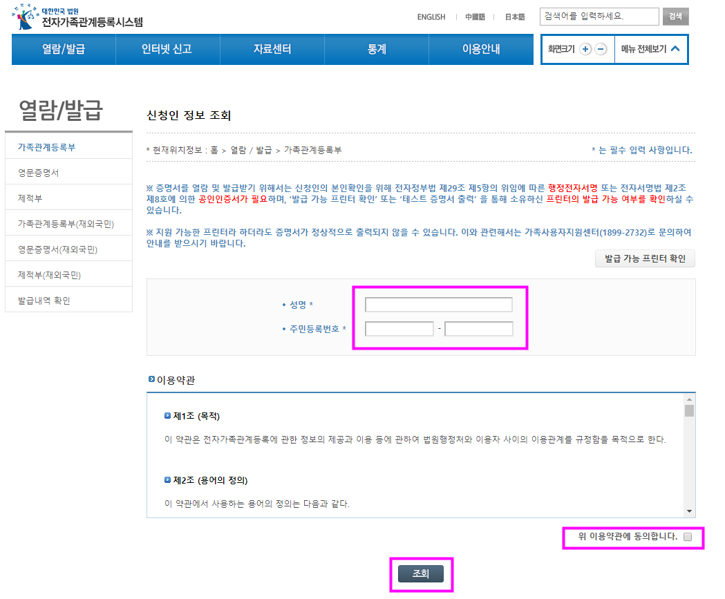 가족관계증명서 인터넷발급을 위해 성명, 주민등록번호를 기재후 아래의 오른쪽 하단의 이용약관을 동의하시고 조회를 눌러주세요.