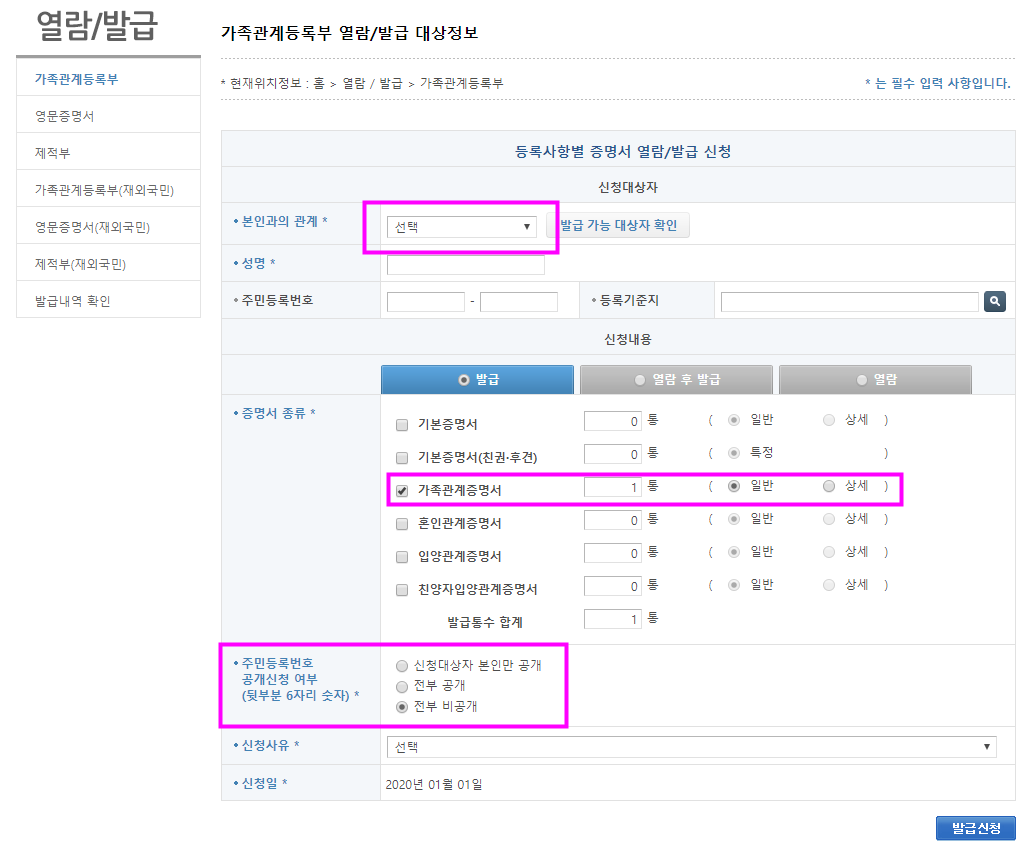 7. 가족관계증명서 열람/발급 대상 정보 기입