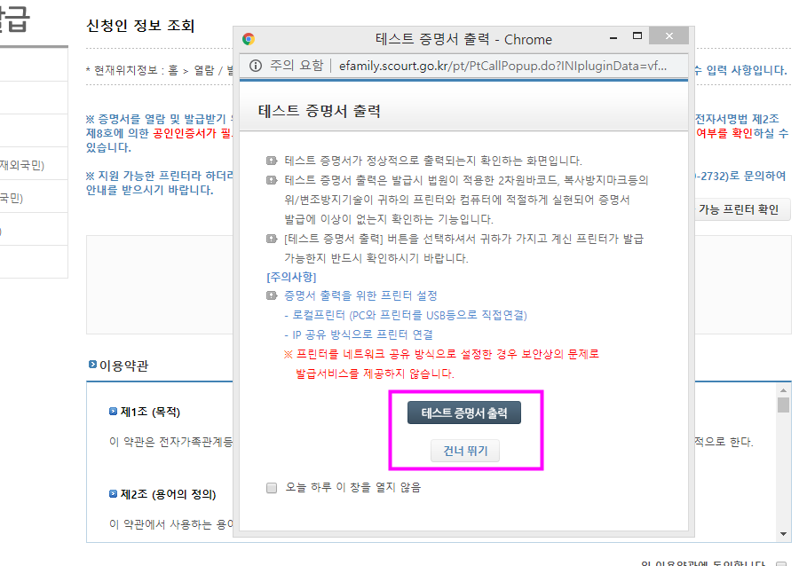 클릭을 하시면 테스트 증명 출력 팝업창이 뜨실 거예요. 현재 프린트로 발급되는지 확인해보기 위해서 테스트 출력을 클릭하셔도 되고, 그냥 바로 가족관계증명서 인터넷발급을 하면서 프린트하셔도 됩니다.