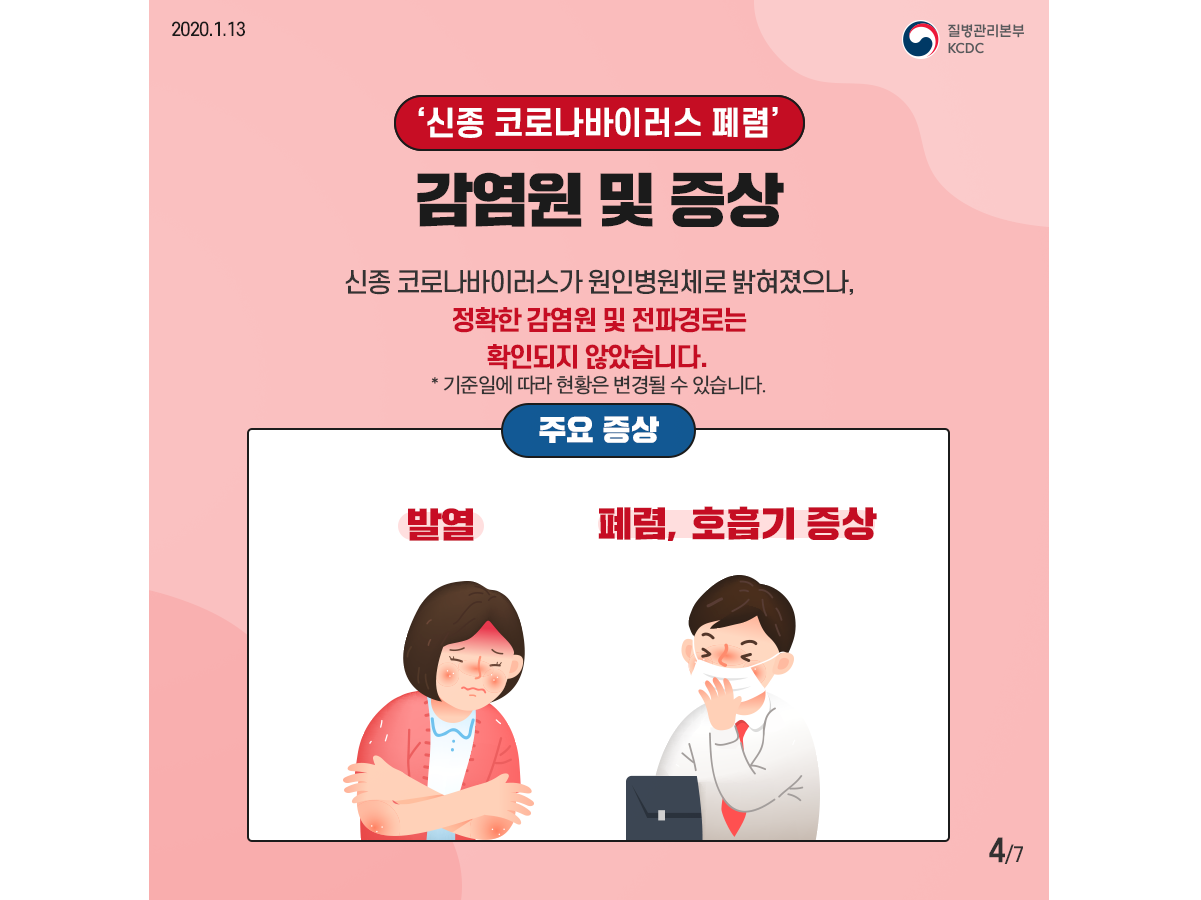 초기에는 기침이 없고 인후통만 있었으며, 폐렴이 없고 인후통과 가벼운 기침과 가래만 있을 수 있다고 합니다. 기침과 호흡곤란이 약하거나 없을 수도 있다고 합니다. 가장 확실한 증상은 발열과 인후통이라고 합니다.