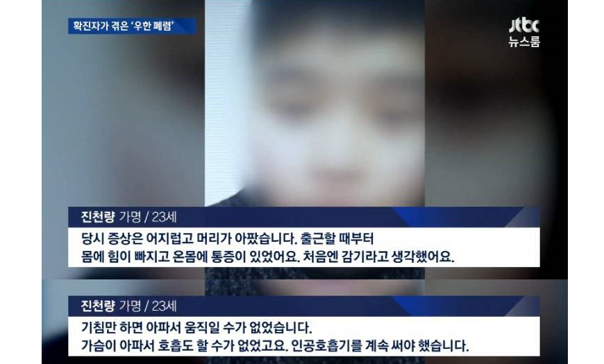 확진자는 머리가 아프면서 몸살기운이 돌면서 감기 증상인 줄 알았다고 합니다. 하지만 신종 코로나 바이러스 증상과 같이 기침을 할때 가슴이 아프고, 시간이 지나면 숨 쉬는 것조차 아파 결국 인공호흡기를 쓸 정도였다고 하네요. 신종 코로나바이러스 잠복기는 최장 14일로 감염자와 같은 공간에 있었거나 위험 지역에 다녀왔다면 신종 코로나바이러스 예방에 주의하셔야 합니다. 그리고 다녀오신 후에는 신종 코로나바이러스 증상 여부를 잘 체크하셔야 해요.
