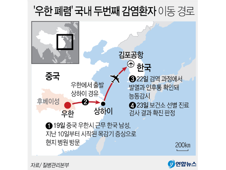 이 남성은 우한시에서 상하이를 경유하여 한국에 들어왔는데요. 지난 10일에 인후통이 시작되었다고 합니다. 입국 시 검역과정에서 인후통과 열이 확인되어 22일 능동 감시대 장자로 분류되었습니다. 그리고 23일 검사 결과 신종 코로나 바이러스 결과에서 양성을 받아 신종 코로나 바이러스 한국 확진 판정을 받았습니다.