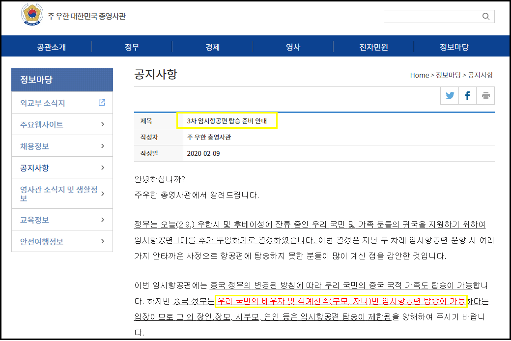 2월 9일 주우한 총영사관 사이트에는 3차 임시항공편 탑승준비를 안내하는 글이 등재되었는데요. 한국 국적의 교민의 배우자와 직계친족인 부모와 자녀도 중국 국적이라도 탑승을 가능해졌습니다. 하지만 연인이나 시부모나 장인, 장모는 3차 우한 전세기에 탑승이 불가합니다.