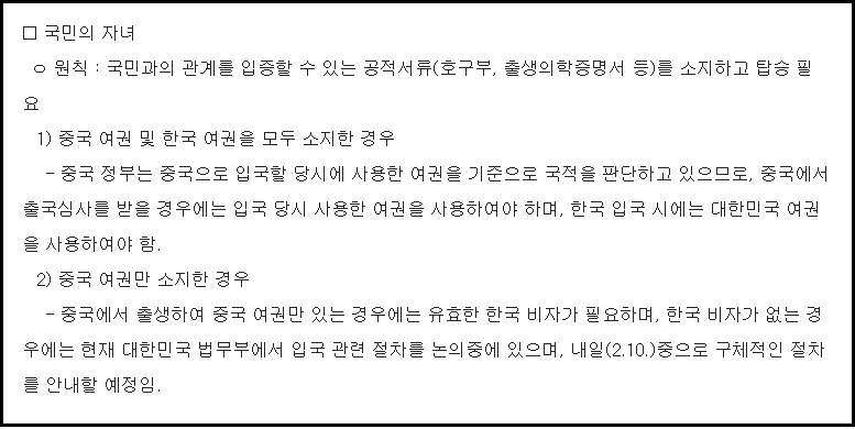 중국 여권만 가진 자녀라면 한국방문이 가능한 유효한 비자가 필요합니다. 만약에 한국 비자가 없을 경우 한국에서 어떻게 입국을 진행할지 의논중이며 2월10일에 입국 절차에 대한 공지가 다시 안내될 예정입니다.